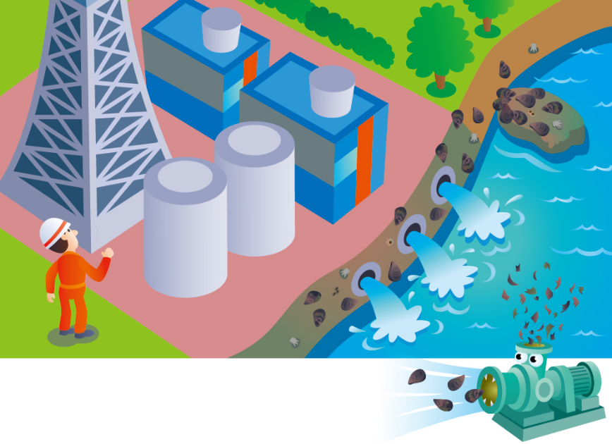 破砕ポンプで発電所の配管内にある貝殻類を除去。