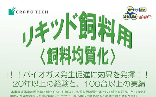 リキッド飼料用<飼料均質化>バイオガス発生促進に効果を発揮!!20年以上の経験と、100台以上の実績